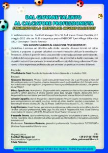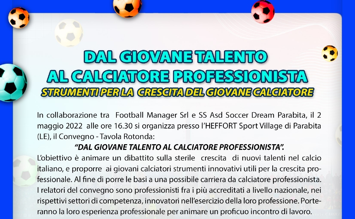 PARABITA (LE) – L’Heffort Sport Village di Parabita si prepara ad aprire i battenti per accogliere il Convegno – Tavola Rotonda “DAL GIOVANE TALENTO AL CALCIATORE PROFESSIONISTA”, nato dalla collaborazione tra Football Manager Srl e SS Asd Soccer Dream, curato nei minimi dettagli dalla Responsabile Organizzativa Silvia Patruno.