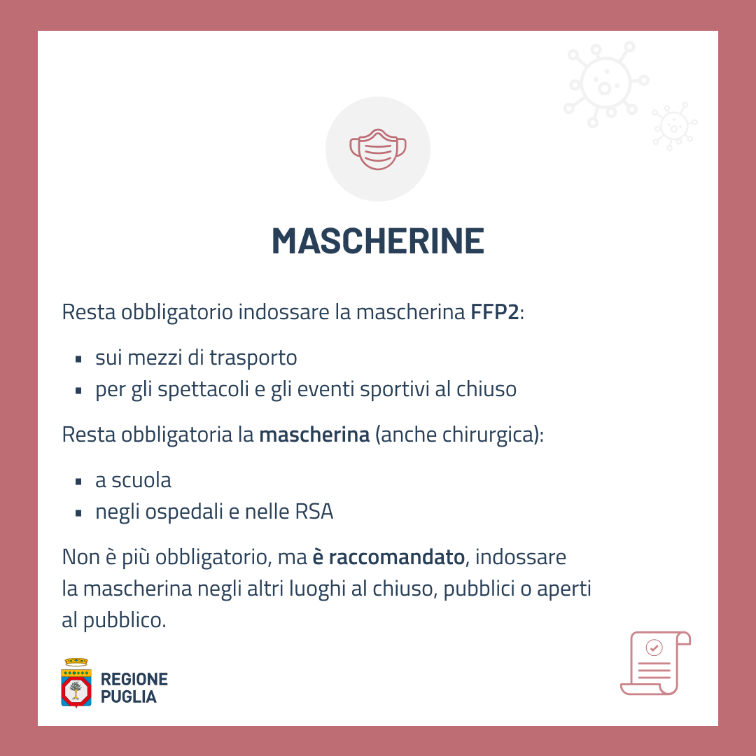 Resta in vigore fino al 15 giugno l’obbligo di vaccinazione per gli over 50, forze dell’ordine e comparto scuola dove l’obbligo di indossare le mascherine, anche solo chirurgiche, continuerà sino alla fine dell’anno.