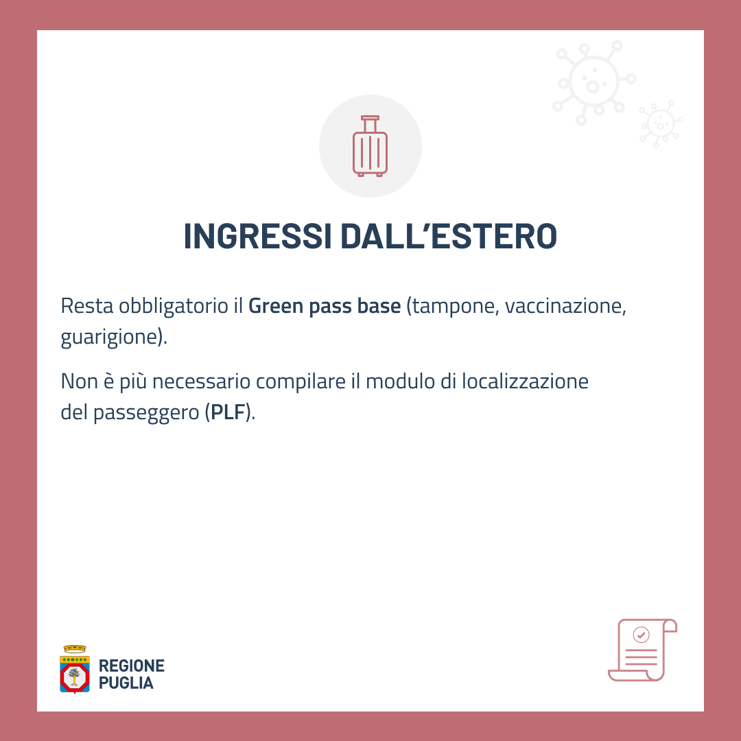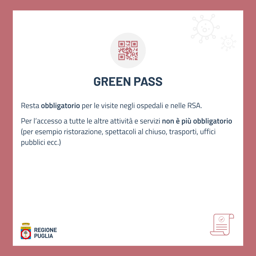 SALENTO – Dal primo maggio il green pass potrà essere archiviato. E’ la prima e più importante novità della nuova ordinanza del ministro Speranza che da domenica cambierà le regole anti contagio in vigore sinora. Sarà obbligatorio esibirlo solo nelle Rsa, almeno sino al 31 dicembre.