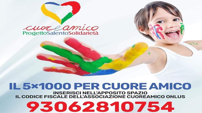 CuoreAmico è la onlus del Salento per i bambini del Salento che, affetti dalle più disparate patologie, devono fare i conti con la difficoltà a muoversi in auto comodamente e in sicurezza, o le cui famiglie hanno difficoltà a far quadrare i conti di casa. Ed ecco che, da oltre 20 anni, la onlus arriva a dare una mano dove il servizio sanitario nazionale si ferma. È così che il cuore colorato, inconfondibile simbolo di concretezza e trasparenza, perché ogni centesimo donato va a finire nelle case in cui c’è bisogno, è diventato il logo del “Salento buono”, di una terra che fa, di una gente che tende sempre la mano. Le automobili speciali attrezzate al trasporto di chi è in carrozzina, i salvadanai, la comunità che si stringe per non lasciare nessuno indietro, come avvenuto in piena pandemia con la raccolta alimentare, sono i motivi per cui ricordarsi di CuoreAmico anche ora. Basta pochissimo: cinque secondi per scrivere, nello spazio apposito della dichiarazione dei redditi, “CuoreAmico onlus” e riportare il codice fiscale 93062810754. Una goccia fondamentale nel mare infinito della solidarietà.