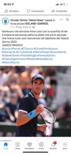 “Sembrava che dovesse finire tutto con la sconfitta di ieri e invece… E invece no, era un piccolo sogno troppo bello per terminare in questo modo, doveva esserci un’altra possibilità. Ci speravamo ed è arrivata. Si scrive una nuova, storica pagina per il nostro Circolo: per la prima volta nella nostra storia, uno dei nostri giocatori entra nel tabellone di un torneo del Grande Slam. Benvenuto al Roland Garros 2022. Adesso tocca a te. VAMOS FRANCO!”.