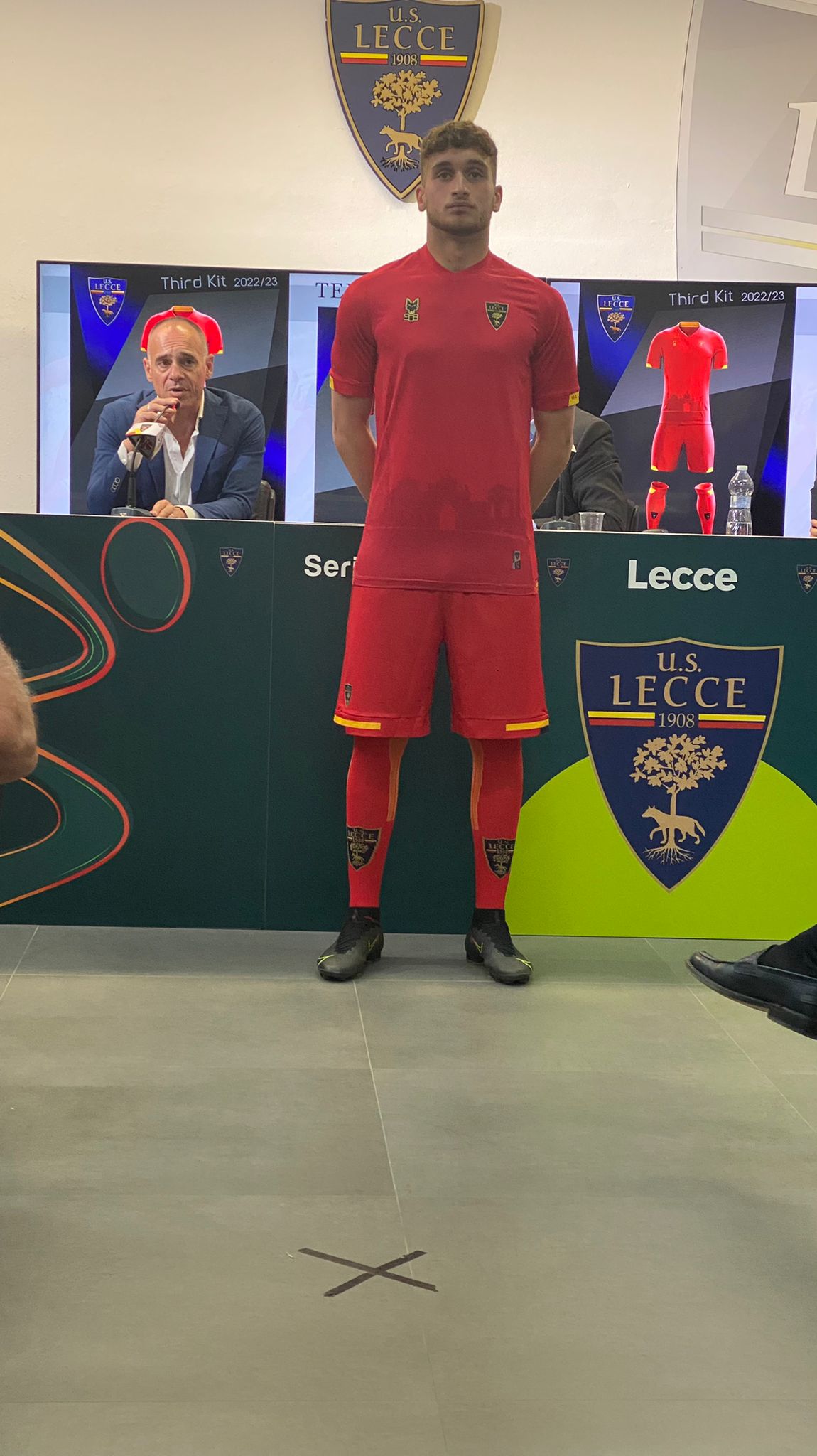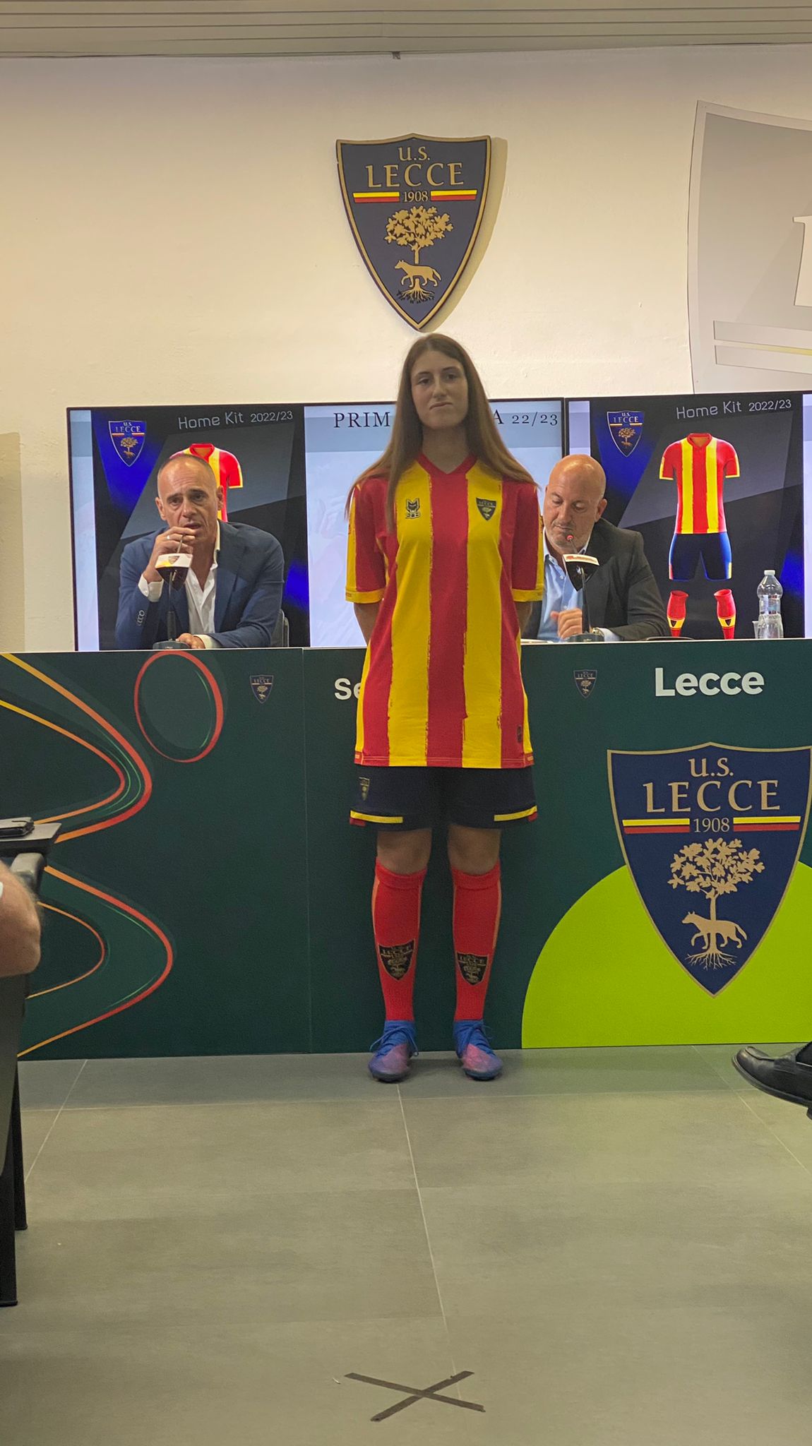 Durante la conferenza stampa sono state presentate le nuove maglie. A presentarle Andrea Micati, responsabile marketing. “Saranno disponibili tra fine luglio e inizio agosto. Possono prenotarsi da subito. A indossare la maglia giallorossa Chiara Crusafio, calciatrice del Lecce Women. Le strisce verticali sono più larghe con bordi irregolari.