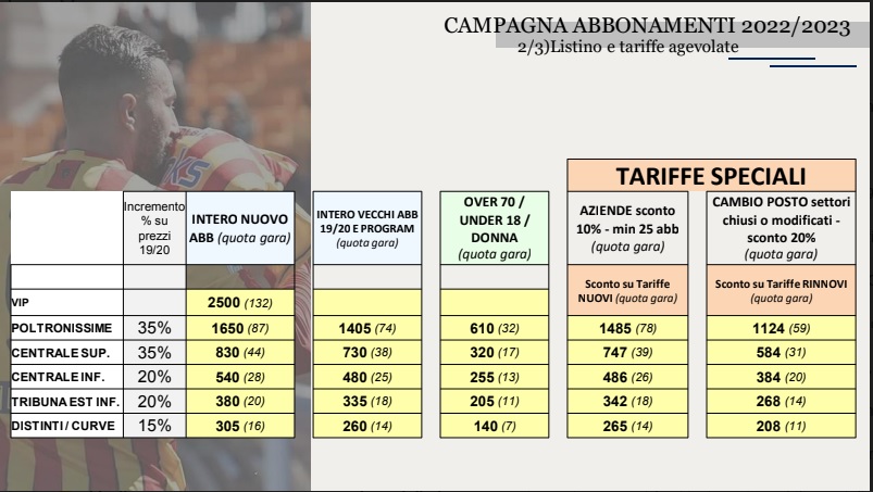 Gli abbonamenti (con relativa rateizzazione, se preferita) potranno essere sottoscritti allo stadio Via del Mare.