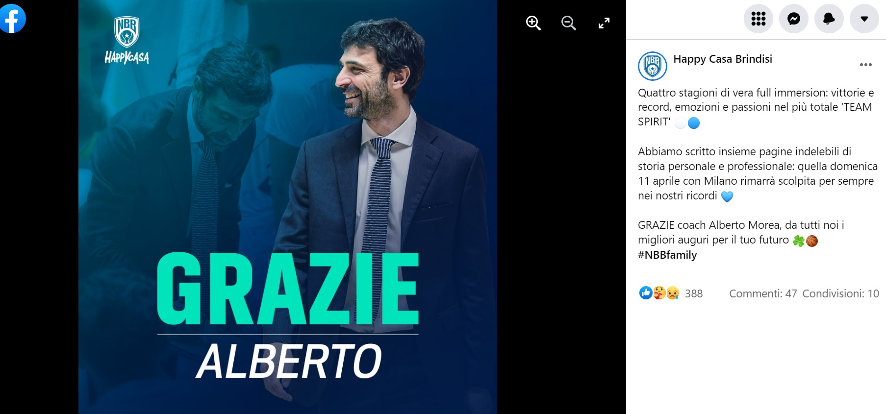 Questo il saluto che Happy Casa Brindisi ha dedicato sui social ad Alberto Morea, il vice di Frank Vitucci degli ultimi quattro anni che ha deciso di proseguire la sua attività professionale a Treviso dove sarà il secondo di Nicola.