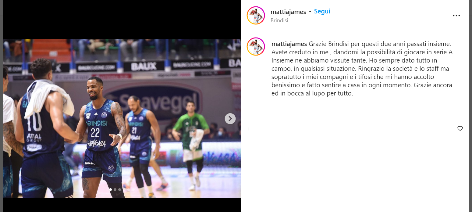 “Grazie Brindisi per questi due anni passati insieme. Avete creduto in me , dandomi la possibilità di giocare in serie A. Insieme ne abbiamo vissute tante. – Ha scritto – Ho sempre dato tutto in campo, in qualsiasi situazione. Ringrazio la società e lo staff ma sopratutto i miei compagni e i tifosi che mi hanno accolto benissimo e fatto sentire a casa in ogni momento. – Ed ha concluso così – Grazie ancora ed in bocca al lupo per tutto”.