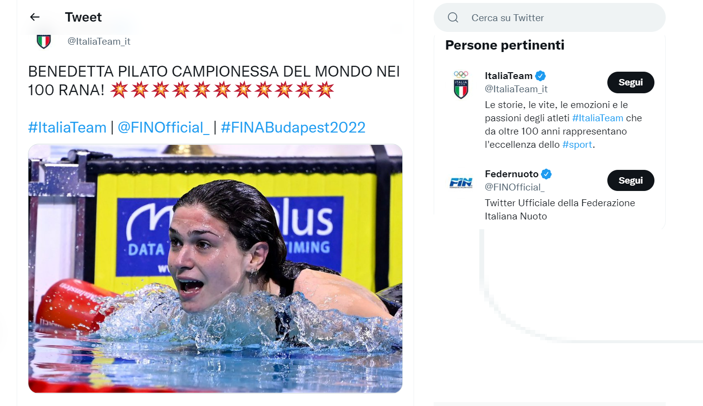 Ai Mondiali di nuoto di Budapest, con una prova straordinaria e perfetta la tarantina Benedetta Pilato, si è laureata campionessa del mondo nei 100 rana, grazie al tempo di 1’05″93.