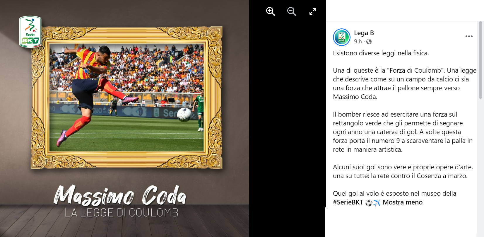 Una di queste è la “Forza di Coulomb”. Una legge che descrive come su un campo da calcio ci sia una forza che attrae il pallone sempre verso Massimo Coda.