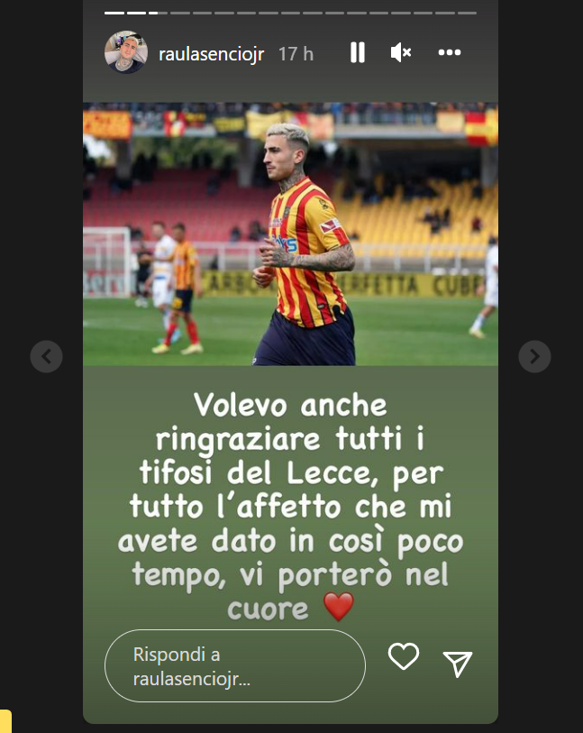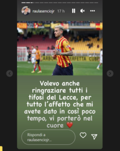 Lecce è una piazza che rimane nel cuore di tutti i calciatori che vestono la maglia giallorossa, che sia un giorno o dieci anni, quella maglia è come un tatuaggio sull’anima e questo è determinato da molteplici fattori: accoglienza, cordialità, calore, bellezza, passione e potremmo continuare ad aggettivare per ore la città, la squadra, lo stadio ed i tifosi. Ultimo in ordine di tempo è stato l’attaccante Raul Asencio, pochi mesi in giallorosso, senza incidere, senza un gol, ma nel momento dell’addio ha scritto su Instagram: “Vi porterò nel cuore”.