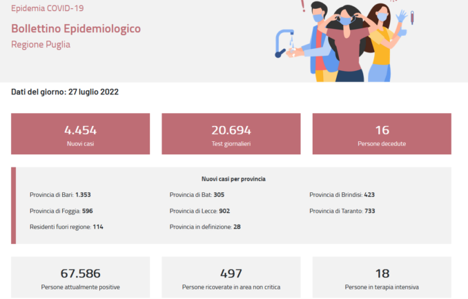 PUGLIA – Sono 4.454 i nuovi casi di Covid rilevati Puglia su 20.694 test giornalieri registrati, le vittime sono state 16.