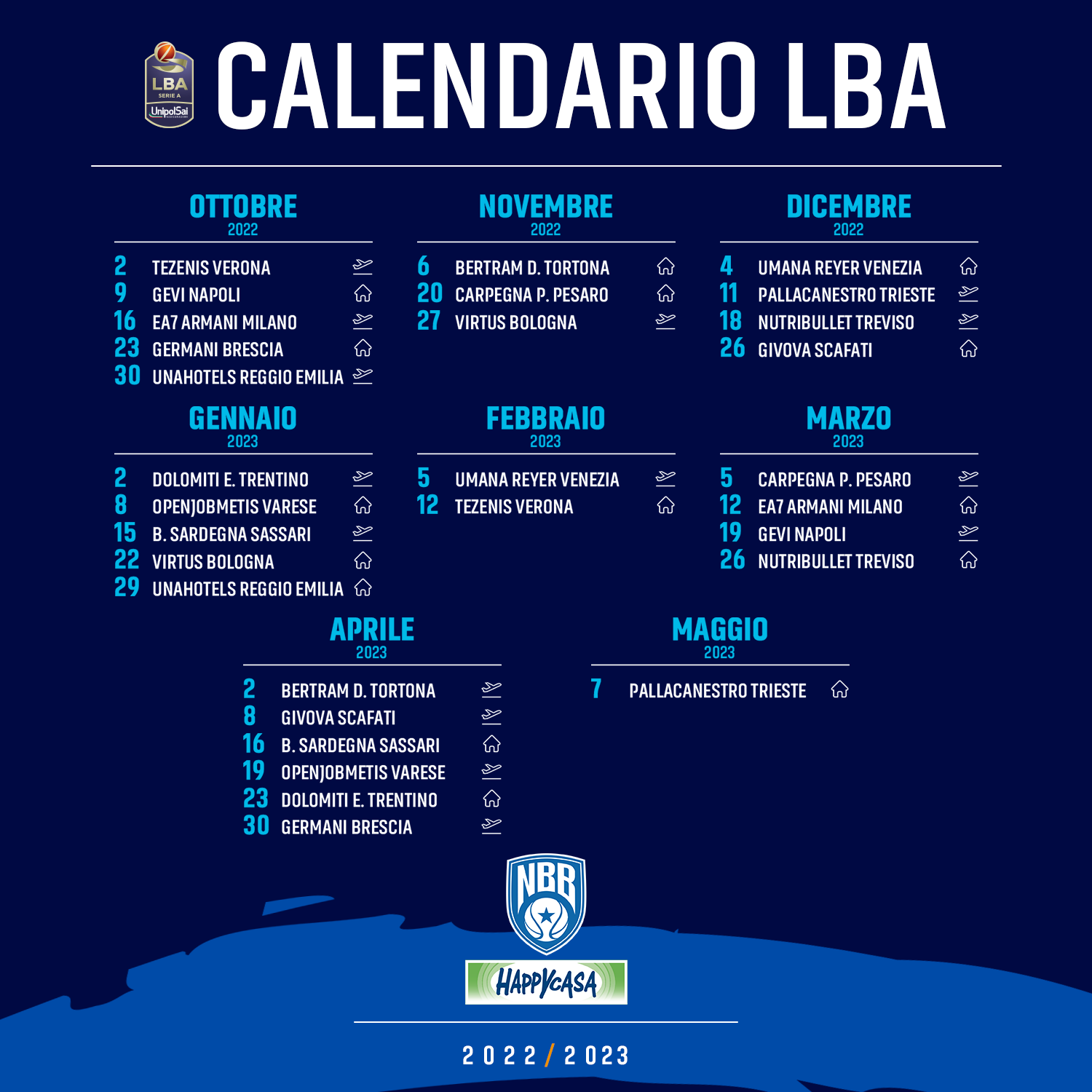 Happy Casa Brindisi partirà in trasferta domenica 2 ottobre in casa della neopromossa Verona; la settimana dopo, il 9 ottobre, esordio al PalaPentassuglia nel primo derby del sud contro Napoli. Anche quest’anno sarà un Santo Stefano casalingo per i biancoazzurri con la sfida interna contro l’altra neopromossa Scafati, protagonista del ritorno in Campania al Sabato Santo pre-Pasqua dell’8 aprile. Si chiude la regular season in casa contro Trieste il 7 maggio.