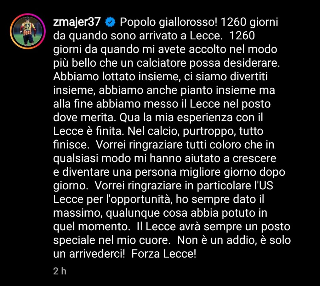 LECCE – (Tonio De Giorgi) Quella di Zan Majer non è stata una cessione qualsiasi  e tanti tifosi avrebbero visto bene Majer anche nella squadra della prossima stagione. Però così va il calcio. Consapevole dei nuovi programmi dell’area tecnica, il centrocampista sloveno, con il passare dei giorni, ha dovuto accettare la decisione che il suo futuro sarebbe stato lontano da Lecce. Ufficializzata la cessione a titolo definitivo alla Reggina, Zan ha affidato al suo profilo social Instagram il suo “arrivederci” al popolo giallorosso. Ecco il post di Zan, l’uomo dell’ultima promozione del Lecce.