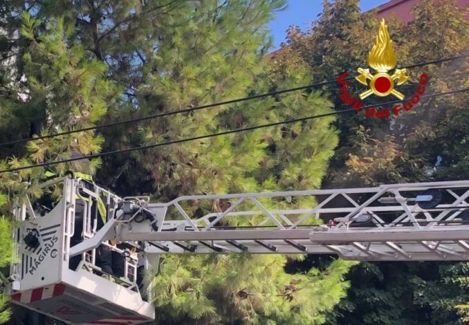 LECCE-Paura in viale Marche a Lecce dove il ramo di un albero era finito sulla linea elettrica che alimenta i filobus.  Da qui l’intervento dei vigili del fuoco che hanno dapprima disposto sia la chiusura della strada che il distacco dell’alimentazione dei cavi. Subito dopo, servendosi di un’autoscala, hanno  messo in sicurezza la zona e provveduto alla rimozione del ramo pericolante.