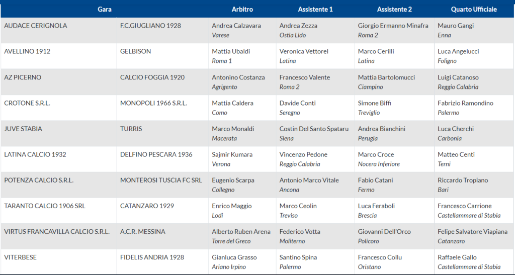 Mentre Virtus Francavilla-Messina sarà diretta da Alberto Ruben Arena di Torre del Greco, coadiuvato da Federico Votta di Moliterno e Giovanni Dell’Orco di Policoro; IV Ufficiale Felipe Salvatore Viapiana di Catanzaro.