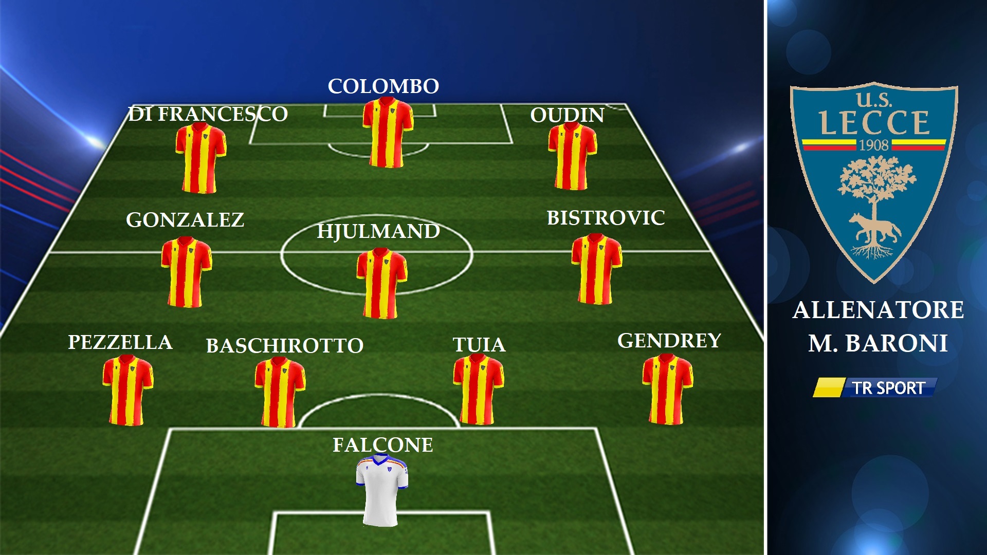 LECCE (4-3-3): Falcone; Gendrey, Tuia, Baschirotto, Pezzella; Bistrovic, Hjulmand, Gonzalez; Oudin, Colombo, Di Francesco. All. Baroni.