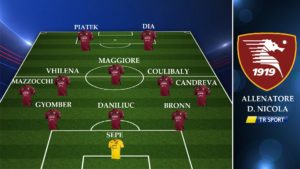 SALERNITANA (3-5-2): Sepe; Bronn, Daniliuc, Gyomber; Candreva, Coulibaly, Maggiore, Vilhena, Mazzocchi; Dia, Piatek. Allenatore: Nicola