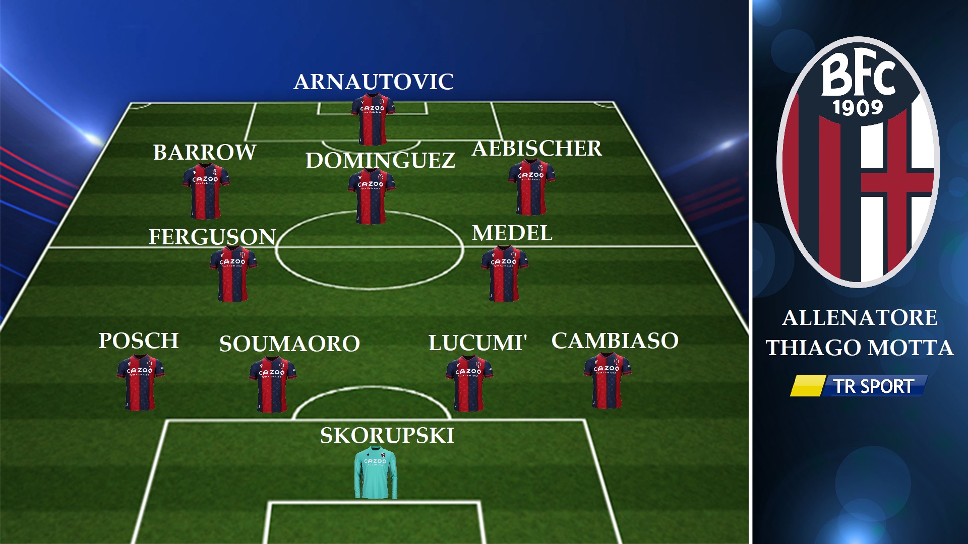 BOLOGNA (4-2-3-1): Skorupski; Cambiaso, Lucumì, Soumaoro, Posch; Medel, Ferguson; Aebischer, Dominguez, Barrow; Arnautovic. Allenatore: Thiago Motta.