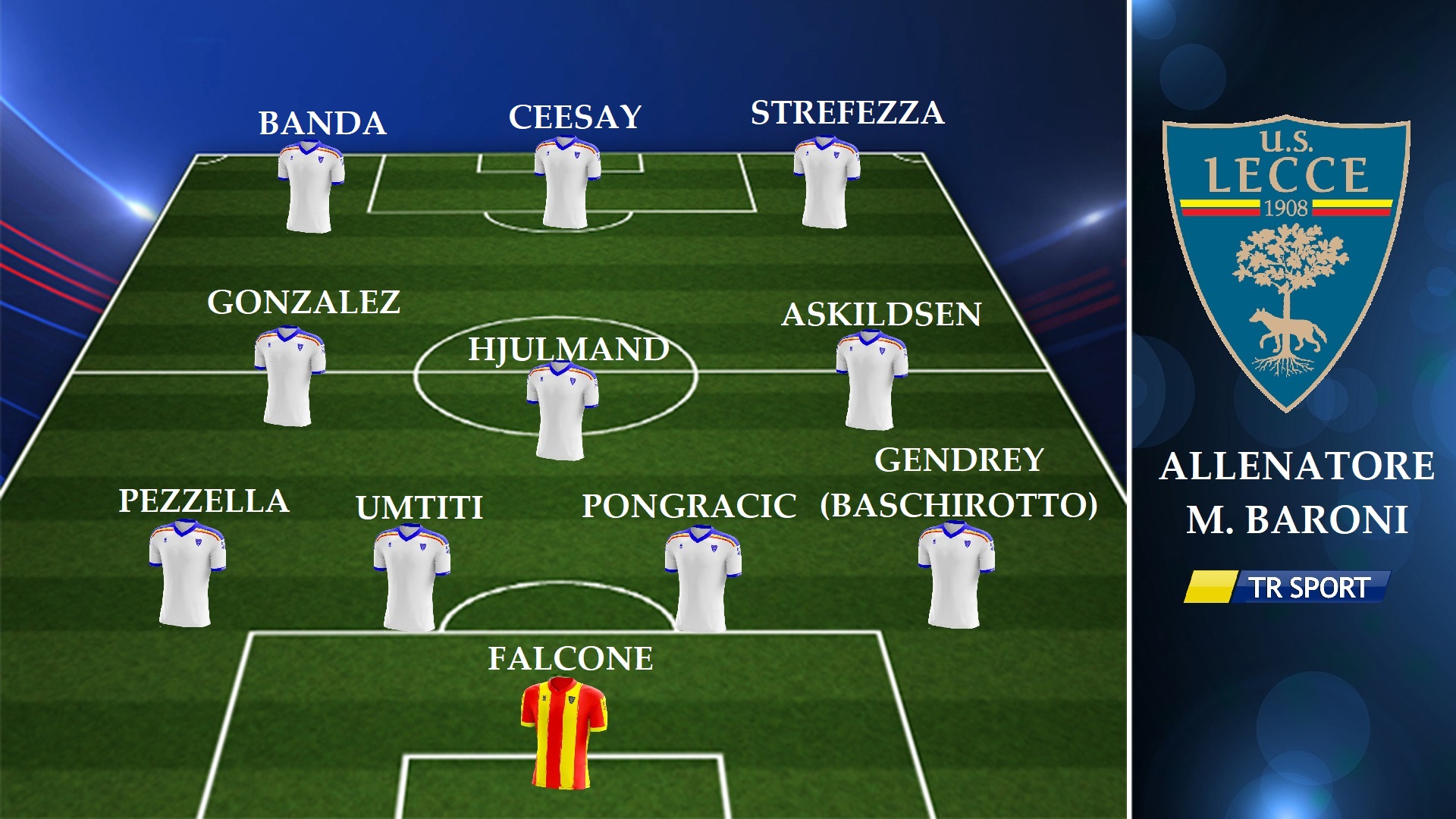 LECCE (4-3-3): Falcone; Gendrey, Pongracic, Umtiti, Pezzella; Askildsen, Hjulmand, Gonzalez; Strefezza, Ceesay, Banda. Allenatore: M. Baroni.