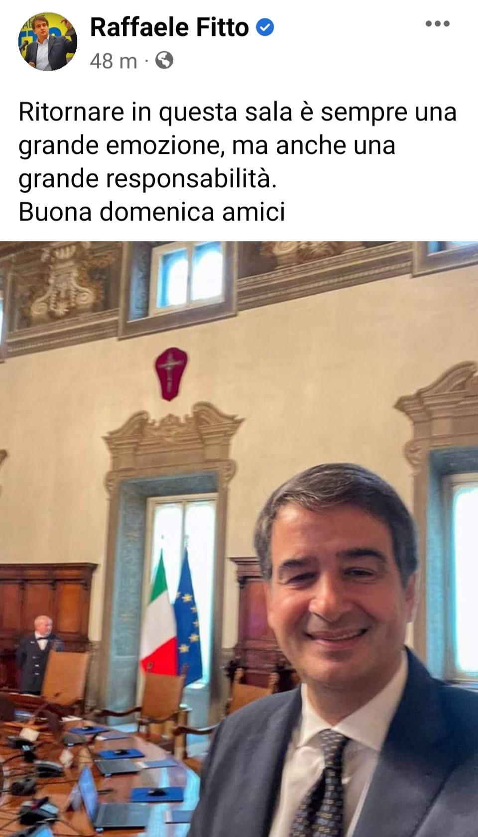 ROMA- Pochi istanti prima della prima riunione del Consiglio dei Ministri arriva il selfie dell’Onorevole Raffaele Fitto Ministro per gli Affari Europei. Intorno a mezzogiorno  scrive sulla sua pagina Facebook: “ritornare in questa sala”, è già stato infatti Ministro degli Affari Regionale, “è sempre una grande emozione ma anche una grande responsabilità. E conclude augurando una buona domenica ai suoi follower.