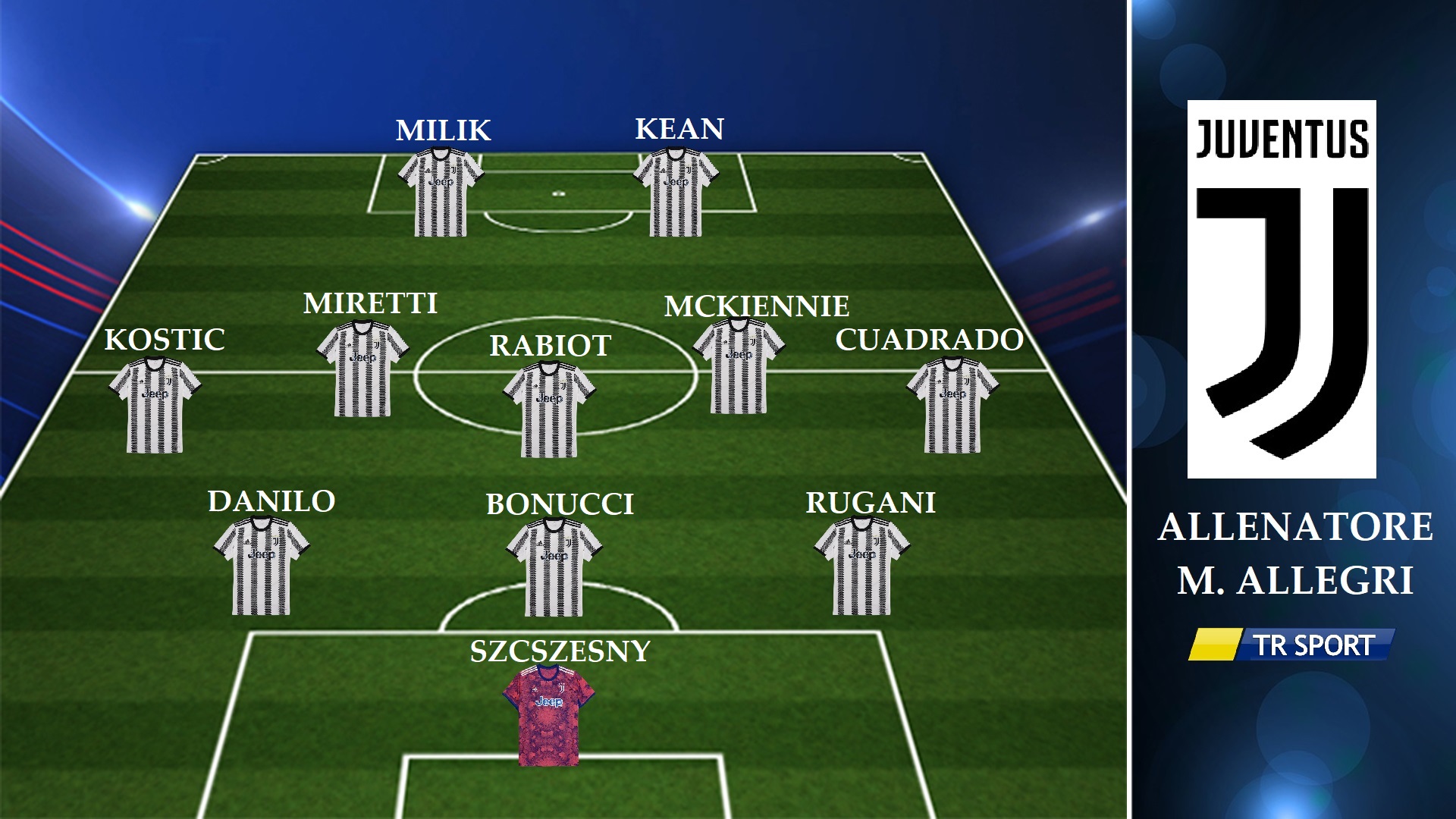 JUVENTUS (3-5-2): Szczesny; Rugani, Bonucci, Danilo; Cuadrado, Mckiennie, Miretti, Rabiot, Kostic; Kean, Milik. Allenatore: M. Allegri.
