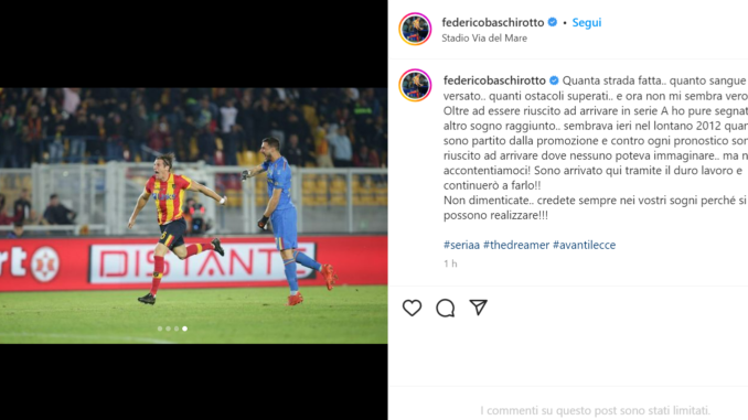 LECCE- Federico Baschirotto ha segnato il suo primo gol in serie A stappando la gara con l’Atalanta, terminata poi 2 a 1 per il Lecce. Al termine della partita ha scritto e descritto le sue emozioni con post corredato da foto su Instagram: