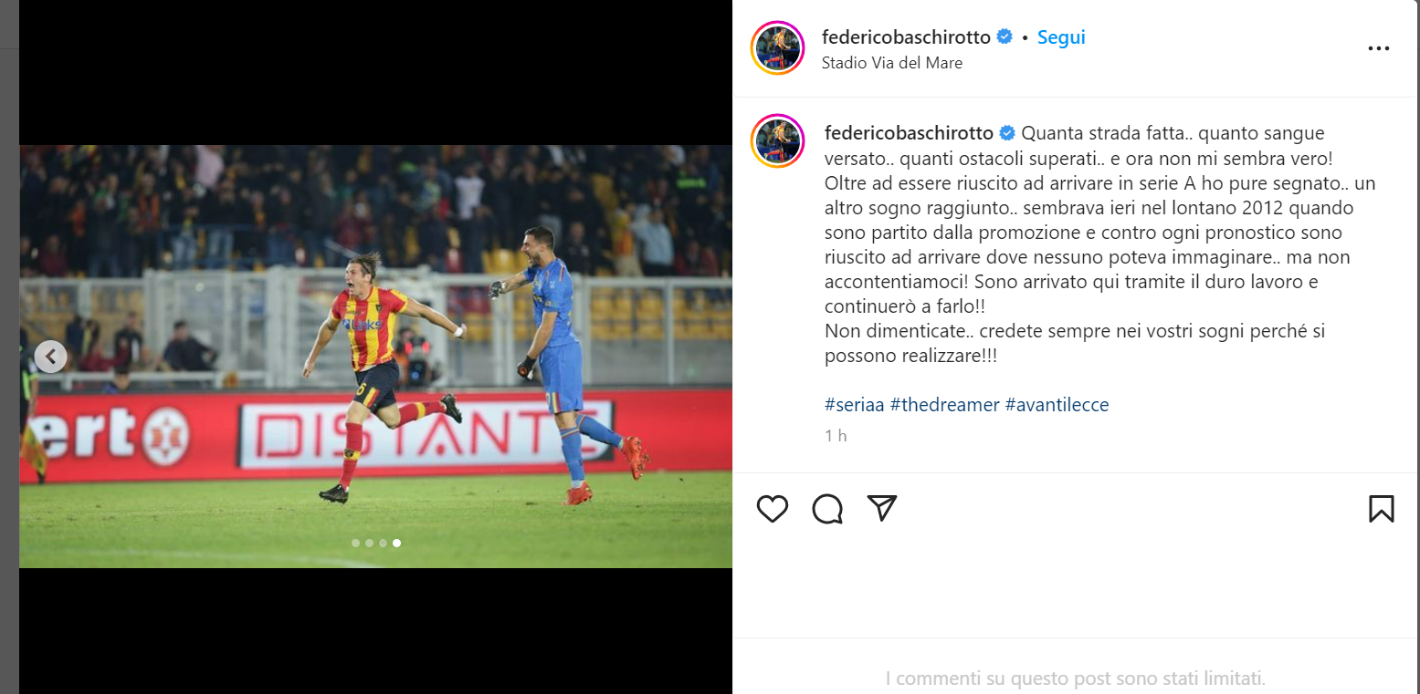 “Quanta strada fatta… quanto sangue versato.. quanti ostacoli superati… e ora non mi sembra vero! Oltre ad essere riuscito ad arrivare in serie A ho pure segnato.. un altro sogno raggiunto… sembrava ieri nel lontano 2012 quando sono partito dalla promozione e contro ogni pronostico sono riuscito ad arrivare dove nessuno poteva immaginare… ma non accontentiamoci! Sono arrivato qui tramite il duro lavoro e continuerò a farlo!! Non dimenticate… credete sempre nei vostri sogni perché si possono realizzare!!!”