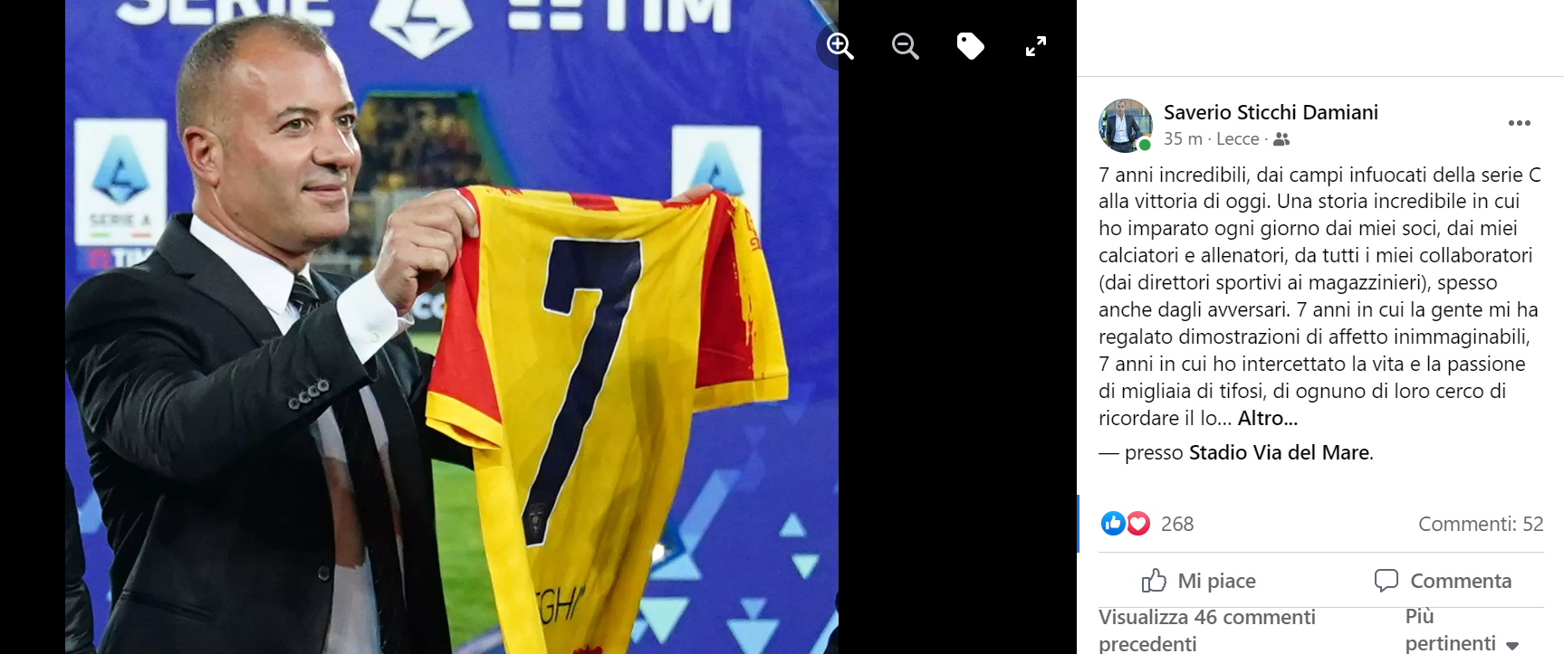 “7 anni incredibili, dai campi infuocati della serie C alla vittoria di oggi. Una storia incredibile in cui ho imparato ogni giorno dai miei soci, dai miei calciatori e allenatori, da tutti i miei collaboratori (dai direttori sportivi ai magazzinieri), spesso anche dagli avversari. 7 anni in cui la gente mi ha regalato dimostrazioni di affetto inimmaginabili, 7 anni in cui ho intercettato la vita e la passione di migliaia di tifosi, di ognuno di loro cerco di ricordare il loro nome, le loro storie, i loro consigli. 7 anni in cui abbiamo portato con orgoglio la maglia del Salento in tutta Italia, per passione autentica, la stessa di chi percorre migliaia di km per pura fede. Oggi il compleanno perfetto, nella nostra casa, in simbiosi con la nostra gente. Avanti così! 💛❤”