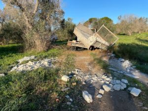 NARDÒ – La dinamica sembra abbastanza chiara: qualcuno voleva scaricare rifiuti edili, ma il cassone del camion si è ribaltato e, probabilmente in preda al panico, chi stava effettuando questa operazione illegale, ha provato a dare fuoco al mezzo.