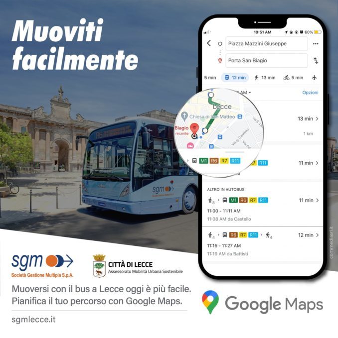 LECCE – Approda su Google Maps il trasporto pubblico di Lecce. Dopo un’attenta fase di sperimentazione e collaborazione con Sgm, Google ha deciso di rendere disponibili nell’applicazione Maps tutti i dati riguardanti linee, orari, fermate e percorsi del trasporto pubblico locale di Lecce. Anche a Lecce, dunque, sarà possibile utilizzare l’app Maps per consultare sui dispositivi mobili, smartphone e tablet (oltre che dal computer), tutti i percorsi e le linee attive del trasporto pubblico locale di Lecce. Utilizzando l’applicazione da Pc, ma soprattutto in mobilità, sarà possibile pianificare i propri spostamenti con il bus in città.  Si potranno scegliere destinazione, data e ora della partenza e dell’arrivo, ma anche avere informazioni sull’ultima corsa disponibile della giornata, per raggiungere un determinato luogo o una serie di opzioni per scegliere il percorso migliore.