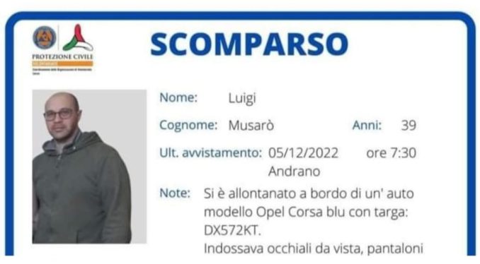 ANDRANO – Non si hanno più notizie di Luigi Musarò, scomparso lunedì mattina dopo essere uscito dalla sua abitazione. L’uomo, di Andrano, è stato visto allontanarsi a bordo di una Opel Corsa di colore blu. La vettura è stata successivamente ritrovata nelle campagne tra Andrano e la frazione di Castiglione di Otranto. Sui sedili dell’auto sono state rinvenute alcune tracce di sangue. Ritrovato anche il telefono cellulare del 39enne che, qualche ora prima della sua scomparsa, avrebbe cancellato il suo profilo Facebook. Le ricerche intanto proseguono, i Vigili del fuoco del Distaccamento di Tricase e la Protezione Civile stanno scandagliando tutto il Salento anche col supporto del nucleo cinofilo dei Vigili del Fuoco di Lecce. L’uomo indossava degli occhiali da vista, pantaloni scuri e giacca blu. Chiunque lo abbia notato o abbia informazioni può allertare i vigili del fuoco chiamando il 115.