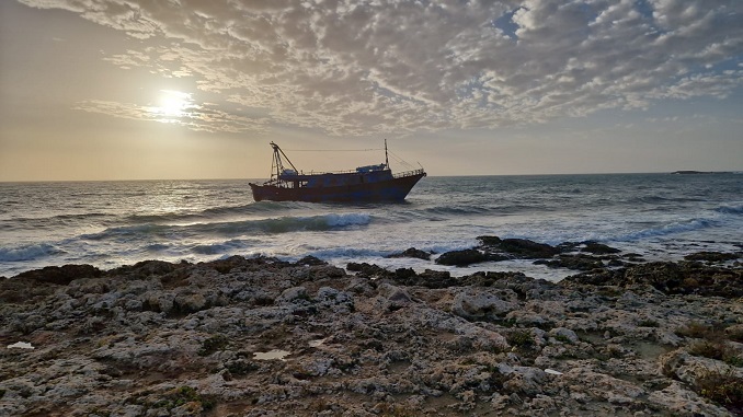 TORRE SAN GIOVANNI -Si infittisce il mistero a poche ore dal ritrovamento del peschereccio arenato a Torre San Giovanni. La presenza di una scritta in arabo sulla fiancata dell’imbarcazione e alcuni indumenti abbandonati sono gli unici elementi su cui incentrare le indagini e dare una risposta alle tante domande sorte.