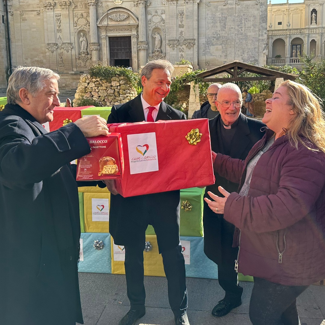 Appuntamento in piazza Duomo, a Lecce, puntuali e animati da quel forte spirito di solidarietà che contraddistingue la Onlus salentina. Affiancata dall’arcivescovo di Lecce Mons. Seccia, la squadra di CuoreAmico ha incontrato le famiglie per porgere i doni e offrire loro tutto il sostegno necessario. Il magazzino della solidarietà, attivo ormai dal periodo d’emergenza sanitaria, quello da cui parte la distribuzione dei pacchi, opera a stretto contatto con la Diocesi. In ognuno dei pacchi, beni di prima necessità, ma soprattutto il calore dell’abbraccio simbolico dell’associazione che non lascia indietro nessuno.