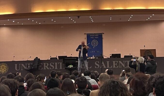 500 gli studenti del triennio delle superiori di 15 diversi istituti scolastici provenienti dai Comuni di Copertino, Gallipoli, Lecce, Maglie, Martano, Nardò, Tricase e da Manduria che hanno riempito d’entusiasmo il centro congressi. Entusiasmo dovuto anche alle brillanti esibizioni del maestro. Tra una riflessione e l’altra ha dedicato, con un preziosissimo Stradivari, alcuni momenti all’esecuzione di brani musicali, regalando ai presenti pensieri… e musica.