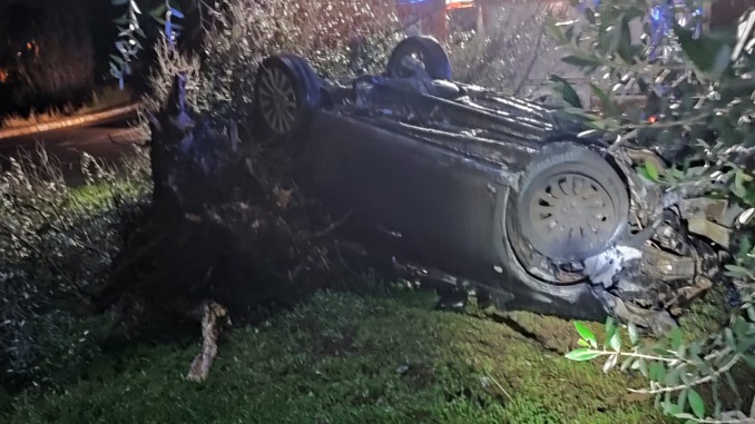 GUAGNANO \ CAMPI SALENTINA – L’auto invade la rotatoria impattando contro un albero d’ulivo, si ribalta e va in fiamme. Un terribile incidente, quello che si è verificato intorno alle 3 di questa notte sulla strada che collega Guagnano a Campi Salentina. Protagonista un 27enne che a bordo della sua Fiat Bravo è uscito fuori strada. Sul posto il 118 che ha trasportato il malcapitato in codice giallo all’ospedale di Lecce, per lui, fortunatamente, solo alcuni traumi. All’arrivo dei vigili del fuoco di lecce, C.M. (queste le iniziali del giovane) era già stato preso in cura dal personale sanitario. I caschi rossi hanno provveduto allo spegnimento del rogo e alla messa in sicurezza della zona. Nessun altro mezzo è rimasto coinvolto.