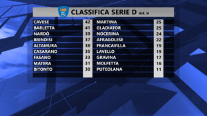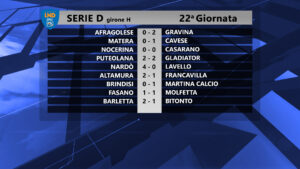 LECCE – In Serie D si è giocata la 22^ giornata. La Cavese è uscita vincitrice da Matera grazie a un gol a due minuti dalla fine di Magrì. E il Nardò non perde le distanze rimanendo a tre punti sotto grazie al 4-0 contro il Lavello. Cade, in casa il Brindisi, punito dall’ex Ancora.