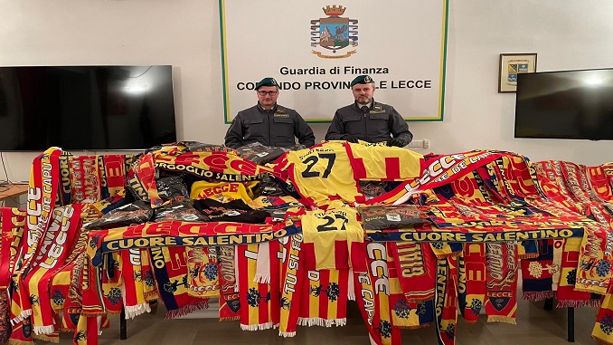 LECCE – Circa 200 capi d’abbigliamento tra felpe, maglie, ma anche sciarpe e gagliardetti, ritraenti logo e marchi ritenuti verosimilmente contraffatti, riproducenti i colori sociali e il simbolo dell’Unione Sportiva Lecce.