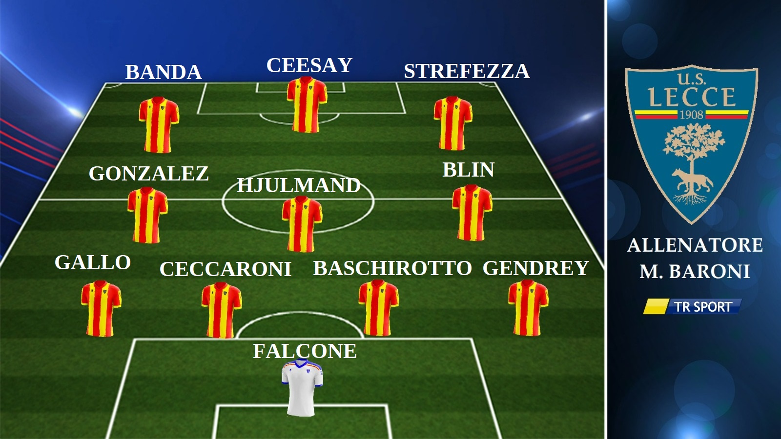 LECCE (4-3-3): Falcone; Gendrey, Baschirotto, Ceccaroni, Gallo; Gonzalez, Hjulmand, Blin; Strefezza, Cesaay, Banda. Allenatore: Marco Baroni.