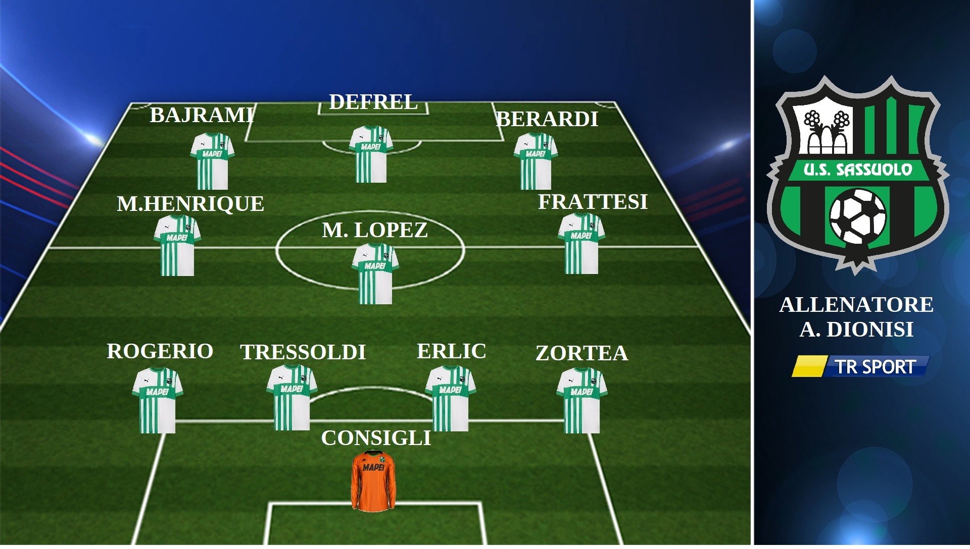 SASSUOLO (4-3-3): Consigli; Zortea, Erlic, Tressoldi, Rogerio; Frattesi, Maxime Lopez, Matheus Henrique; Berardi, Defrel, Bajrami. Allenatore: Alessio Dionisi.