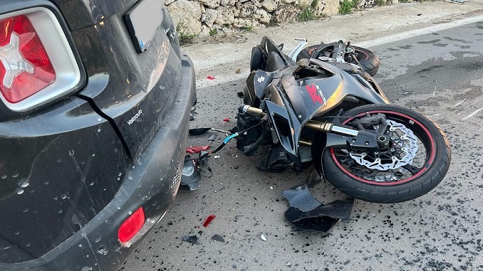 RACALE – Lo scontro, sulla cui dinamica si sta ancora indagando, è avvenuto lungo la strada provinciale 222, che collega Taviano alla marina di Mancaversa, in territorio di Racale. L’impatto si è verificato intorno alle 18,00 tra una Jeep Renegade guidata da una donna, e una moto Suzuki GSX-R con in sella un ragazzo di 22 anni. È stato lui ad avere la peggio, basti guardare le condizioni della moto.