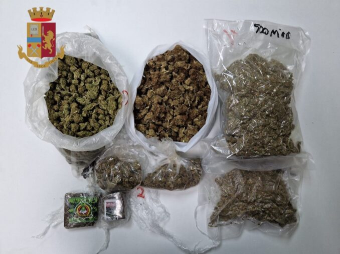 Dopo diversi servizi di appostamento per verificare la fondatezza dei propri sospetti, i poliziotti hanno proceduto ad un controllo dell’immobile. All’interno dell’appartamento, nel quale permeava un fortissimo odore di marijuana, gli agenti hanno rinvenuto all’interno di un ripostiglio: 1.1 chilogrammi circa di sostanza stupefacente del tipo Marijuana suddivisa un varie buste trasparenti; 350 grammi circa di sostanza stupefacente del tipo Marijuana all’interno di un boccaccio di vetro trasparente, un borsello all’interno del quale era custodita sostanza stupefacente del tipo hashish suddivisa in due panette del peso di 85 grammi circa l’una e di 80 grammi l’altra; 4 bilancini di precisione di diverse marche ed un hard disk con relativo cavetto.