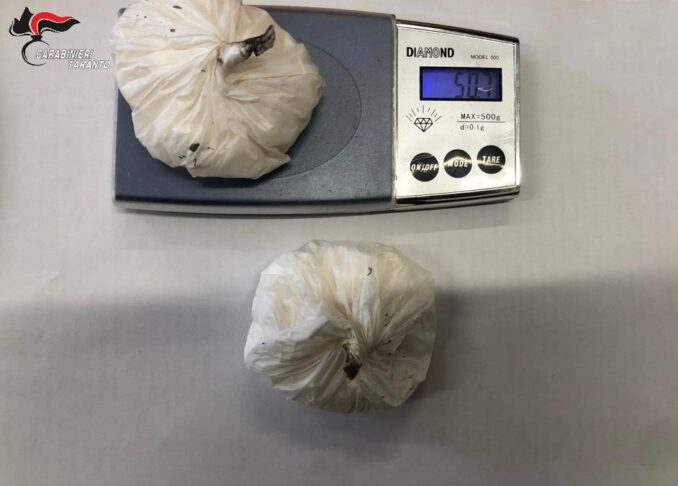 TARANTO – Anche durante le festività della Pasqua non si ferma l’attività di prevenzione del Comando Provinciale Carabinieri di Taranto. I Carabinieri della Sezione Operativa della Compagnia di Taranto, nella mattina del 7 aprile, hanno arrestato un 54enne tarantino presunto responsabile del reato di detenzione e spaccio di sostanze stupefacenti. In particolare i militari nel corso di un servizio di pattugliamento sull’arteria stradale della SS 106 jonica, hanno notato un’autovettura procedere ad alta velocità. Il sorpasso dell’auto a velocità sostenuta, ha insospettito i Carabinieri a tal punto da seguirla fino a quando il conducente si è fermato nel parcheggio di un distributore di carburanti. I Carabinieri lo hanno controllato e sottoposto a perquisizione personale: in suo possesso hanno rinvenuto due involucri in plastica, contenti complessivamente circa 100 grammi di sostanza stupefacente del tipo cocaina, ancora da suddividere in dosi singole per lo spaccio al dettaglio. La sostanza stupefacente è stata consegnata al Laboratorio Analisi Sostanze Stupefacenti del Comando Provinciale dei Carabinieri di Taranto, per le conseguenti analisi. L’uomo, fatta salva la presunzione di innocenza fino a sentenza definitiva, al termine delle formalità di rito, su disposizione dell’Autorità Giudiziaria, è stato condotto in carcere.
