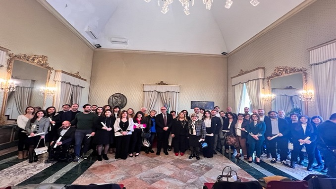 LECCE – Si è svolta, nella mattinata odierna, presso i saloni di rappresentanza della Prefettura, la cerimonia di consegna dei diplomi di abilitazione ai 45 Ufficiali di Stato Civile, dipendenti di vari comuni della provincia, che hanno partecipato all’ultimo corso di abilitazione svoltosi in collaborazione con l’Associazione Nazionale Ufficiali di Stato Civile ed Anagrafe.