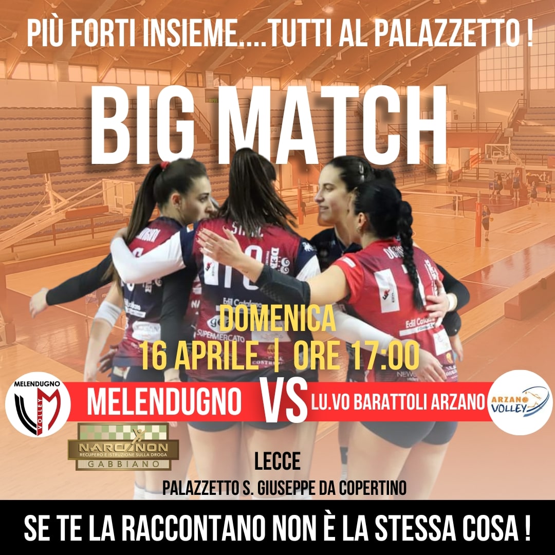 In chiave play off della B1 femminile ma anche come primo posto potrebbe essere una sfida decisiva. Ecco perché in una nota la società melendugnese esorta i tifosi ad esserci: la settima giocatrice in campo potrebbe risultare determinante in questo delicato match con prima battuta alle ore 17.00.