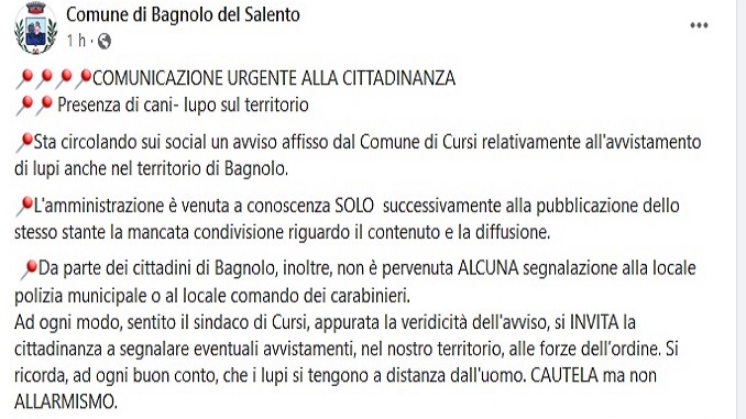 É ormai da diverso tempo, infatti, che circola sui social un avviso del Comune di Cursi riguardo un presunto avvistamento di lupi all’interno del territorio di Bagnolo. Le forze dell’ordine dello stesso Comune hanno però riferito di non aver ricevuto alcuna segnalazione in tal senso da parte dei cittadini.
