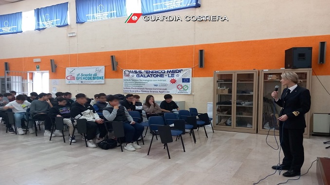 GALLIPOLI – Ancora una volta, la Capitaneria di porto di Gallipoli è ben lieta di accogliere l’invito dell’Associazione di Promozione Sociale UniROCA nell’ambito del progetto: “Sulle rotte della legalità alla scoperta della bellezza. Un progetto formativo di educazione alla legalità e alla bellezza attraverso il sostegno dell’empowerment individuale e di gruppo in un contesto culturale, naturalistico e marinaresco”. Dopo il Liceo Virgilio Redi di Lecce, è il turno dell’Istituto di Istruzione Secondaria Superiore “Enrico MEDI” di Galatone. Scuole diverse, studenti diversi ma tutti animati dalla medesima passione per l’ambiente, per il mare quale patrimonio inestimabile della collettività. L’incontro si inserisce anche in una settimana particolare, la “Settimana blu” nata quale campagna di sensibilizzazione e di cultura del mare per un’educazione civica al rispetto dell’ambiente marino. Nel corso della mattinata del 19 aprile scorso, il personale della Capitaneria di porto ha esposto le principali attività svolte per la sorveglianza ambientale e la risposta degli studenti è stata una grande soddisfazione, testimonianza del loro impegno per il futuro: tanti gli interventi, le domande, le curiosità. Per loro infatti si è trattato di un’esperienza concreta di avvicinamento alle tematiche ambientali e di sicurezza in mare nel loro percorso formativo e didattico. L’attività di informazione rivolta alle giovani generazioni di studenti si ricongiunge agli obiettivi ed ai compiti della Guardia Costiera, impegnata in tutto ciò che riguarda gli usi civili e produttivi del mare, dalla ricerca e soccorso in mare, alla tutela della sicurezza della navigazione, alla difesa dell’ambiente ed alla tutela del patrimonio ittico e dell’habitat marino e costiero. Particolare attenzione è stata rivolta, nel corso dell’incontro, all’inquinamento dei corsi d’acqua, al ciclo della depurazione delle acque ed alla promozione di comportamenti virtuosi e sono stati illustrati i numerosi compiti svolti in campo ambientale da personale specializzato della Guardia Costiera, come la rilevazione costante di parametri fisico-chimici utili al monitoraggio mediante la tecniche dei campionamenti. Il Presidente di UniROCA ha rivolto al Comandante della Capitaneria di porto di Gallipoli Pasquale Vitiello e al Capitano di Corvetta Alessandra Spagna un ringraziamento particolare per l’attenzione dimostrata verso i giovani studenti, futuri cittadini fruitori del mare. Ha proseguito poi il proprio intervento raccontando il progetto, nato su una barca che veniva utilizzata quale vettore per il trasporto di migranti. Ecco, quella barca affidata poi a Legambiente di Leverano e della Terra d’Arneo, è diventata oggi un laboratorio didattico per tanti ragazzi, si è trasformata in un luogo di giustizia ed ancora una volta di futuro per giovani piccoli adulti che guardano alla vita con una rinnovata speranza di migliorare l’ambiente. La Capitaneria di porto di Gallipoli, sotto il coordinamento della Direzione Marittima della Puglia e Basilicata Jonica, é vicina a questo genere di attività meritorie che dimostrano come le scuole sono il capitale per diffondere la cultura del mare, percorsi formativi che costruiscono un sistema di valori volto ad una nuova coscienza ecologica e che aiutano studenti e studentesse a trovare la giusta rotta nel rispetto dell’ambiente e a preservarlo, ricominciando se necessario con delle diverse e buone pratiche, proprio come la storia di questa barca!