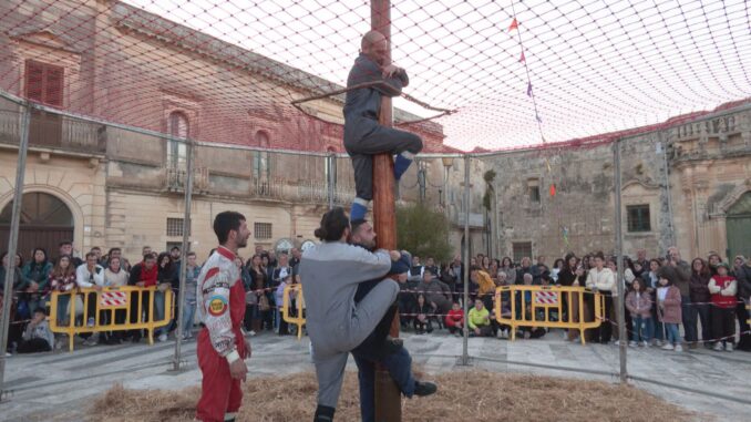 COCUMOLA – Si è conclusa a testa alta “Salento in Cima alla Cuccagna”, la manifestazione che ripropone un antico rito tipico della tradizione pasquale. Dopo tre divertentissimi appuntamenti, questa volta, ha fatto tappa a Cocumola, dove dilettanti e professionisti, grandi e piccinni hanno provato a raggiungere il punto più alto del palo per conquistare premi. L’evento, organizzato per la prima volta nel 2019, è organizzato dalle Associazioni “Madonna di San Fili” di Monteroni di Lecce, “Gli Amici di Bagnolo” di Bagnolo del Salento, “Rioni Collepassesi A.P.S.” di Collepasso e “Associazione Genitori Insieme” di Cocumola, con il patrocinio della Provincia di Lecce. Il programma, come in tutti i paesi che ha coinvolto, ha offerto intrattenimento per tutti i gusti e per tutte le età, attraverso una serie di eventi collaterali: spettacoli, musica, degustazioni, danza, cabaret. Ancora una volta, una tradizione viva nella nostra cultura, che diventa momento di aggregazione e divertimento.