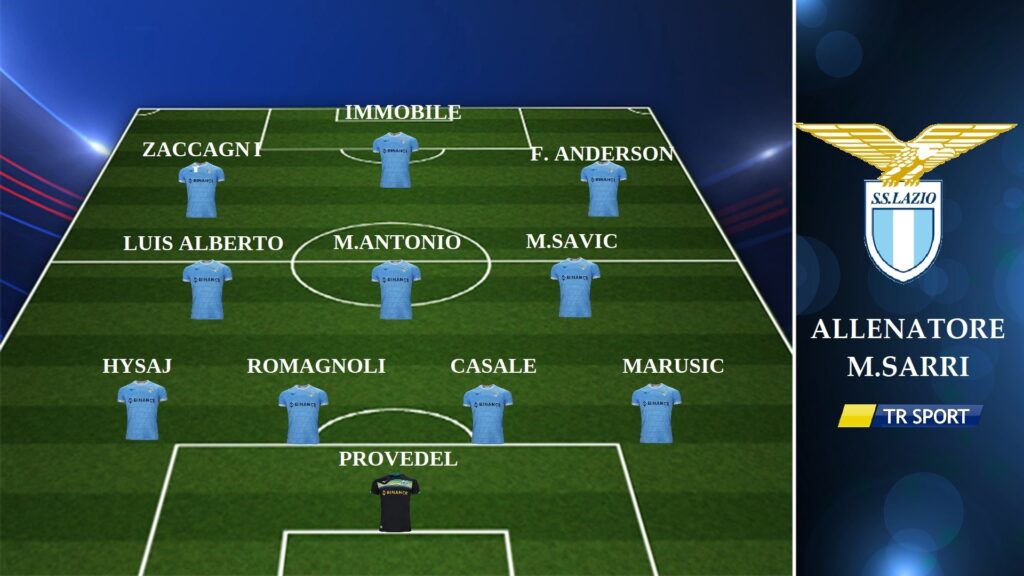 Maurizio Sarri senza Vecino e Cataldi potrebbe scegliere di mandare in campo Provedel tra i pali; Marusic, Casale, Romagnoli e Hysaj sulla linea difensiva; Milinkovic-Savic, Marcos Antonio e Luis Alberto in mezzo al campo, anche se qui potrebbe essere scelto Basic; infine Felipe Anderson, Immobile e Zaccagni nel tridente.