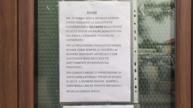 FRIGOLE – Dopo la perdita dell’ufficio postale, poi del parco giochi, della Lega Navale e di un campo sportivo, Frigole dal 22 Maggio perderà anche uno dei due presidi ambulatori presenti. “La Dottoressa svolgerà la sua attività convenzionata soltanto nello studio di Lecce”, questo è l’avviso appeso sulla porta dell’ormai “ex” ambulatorio che ha notificato ai residenti il trasferimento del punto medico a Lecce in pianta stabile. Sull’argomento è intervenuto anche il segretario cittadino del Movimento Regione Salento Giancarlo Capoccia: “ Questa situazione può comportare conseguenze negative per la salute dei residenti, in quanto vi sono moltissime persone anziane che non hanno la possibilità di raggiungere la città in autonomia. Al momento non ci è dato di sapere quali sono i motivi che hanno portato il medico di base ad abbandonare lo studio di Frigole”.