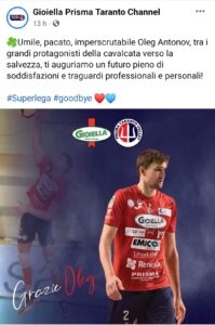 Con queste parole, con un post affidato a facebook, la Gioiella Prisma Taranto saluta Oleg Antonov, il pallavolista originario di Mosca che in questa stagione ha dato tutto, sempre, ogni volta che è stato chiamato in causa.