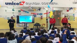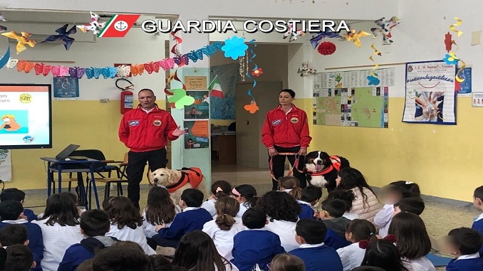 TRICASE – Ancora una volta, la Capitaneria di porto di Gallipoli è stata ben lieta di accogliere l’invito di una scuola salentina. Dopo i numerosi interventi svolti dall’inizio dell’anno ed in particolare durante la “Settimana blu”, nata quale campagna di sensibilizzazione e di cultura del mare per un’educazione civica al rispetto dell’ambiente marino, è il turno della Scuola Primaria “C. Pisanelli” di Tricase. Anche questi piccoli studenti hanno dimostrato di essere animati dalla passione per l’ambiente e per il mare quale patrimonio inestimabile della collettività. Nel corso della mattinata del 16 maggio scorso, il personale della Capitaneria di porto ha esposto le principali attività svolte per la sorveglianza ambientale e la risposta degli studenti è stata una grande soddisfazione, testimonianza del loro impegno per il futuro: tanti gli interventi, le domande, le curiosità. Per loro infatti si è trattato di un’esperienza concreta di avvicinamento alle tematiche ambientali e di sicurezza in mare nel loro percorso formativo e didattico. L’incontro è stato reso ancor più interessante grazie alla presenza dei cani di salvataggio della S.C.I.S.A.R. (Scuola Cinofila Italiana Soccorso Acquatico e Ricerca). L’attività di informazione rivolta alle giovani generazioni di studenti si ricongiunge agli