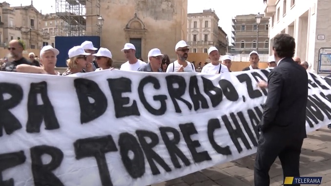 LECCE – “Basta parole, Torre Chianca, così come tutte le marine leccesi deve essere riqualificata con infrastrutture e servizi”. È l’esasperazione che ha spinto i cittadini e l’associazione Marina di Torre Chianca a manifestare in Piazza S. Oronzo per lamentare ancora una volta, dopo anni di esposti e doleances caduti nel vuoto, lo stato di abbandono della marina leccese. Una lunga lista di lacune quella messa nero su bianco: decoro urbano, rete fognaria, disinfestazioni, pulizia dei canali di bonifica, manutenzione del verde e delle aree attrezzate per bambini, pulizia e sicurezza di spiagge e strade. È tanto sì, ma non infattibile, eppure necessario, affinché residenti e turisti possano godersi la marina senza “corse ad ostacoli”. Al loro fianco, i rappresentanti del mondo istituzionale, pronti a farsi portavoce del dissenso e del rammarico esposti a gran voce alle porte di Palazzo Carafa. Da Palazzo di Città a raggiungere la protesta è arrivato poi lo stesso Sindaco che, pur scegliendo di non rilasciare dichiarazioni, ha risposto direttamente ai manifestanti, invitandoli a riaggiornarsi nelle opportune sedi per trovare un accordo e far splendere, come merita, una delle mete salentine più gettonate da turisti e non.